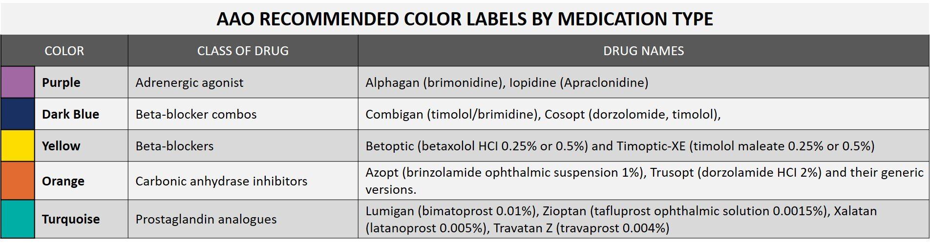 Don’t get your medications confused when you install your adaptor! You may select any colored label that you want, but see the list below for the American Academy of Ophthalmology’s color recommendations based on glaucoma medication type.